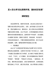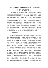 关于公安分局“优化营商环境、服务经济发展”的调研报告优化营商环境、服务经济发展,是当前公安机关的一项重大政治责任和社会责任。当前,如何发扬“公安当先”精神,更好地服务企业、服务民生,是公安机关迫切需要研究解决的重大课题。2022年以来,分局准确把握公安机关服务经济发展的职能定位,始终坚持“平等保护、依法履职、主动服务”的原则,聚焦打击防范、简政放权、执法提升、作风转变持续发力,不断完善服务保障举措,努力为全区构筑重商、安商、暖商的营商环境贡献公安力量。一、现状概述2022年XX分局坚持把“我为群众为实事”作为工作宗旨,聚焦群众急难愁盼,以擦亮户政“窗口”作为切入口,创新“户政窗口流动服务”的工...