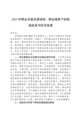 2025年两会专题党课:两会视角下的税收政策与经济发展专题党课报告同志们:在刚刚结束的2025年全国两会上,政府工作报告对当前经济形势进行了深刻剖析,明确了一系列推动经济发展的政策举措。其中,税收政策作为宏观调控的重要手段,在促进经济增长、稳定就业、推动产业升级等方面发挥着关键作用。本次党课,我们将围绕两会视角下的税收政策与经济发展展开深入探讨,结合工作实际,分析税收政策如何在复杂多变的经济环境中助力经济高质量发展。一、两会聚焦经济发展中的税收调节作用。今年两会是在国内外经济形势复杂严峻的背景下召开的。从国际看世界经济增长动能不足,单边主义、保护主义加剧,地缘政治紧张因素较多,国际市场波动风险...