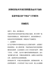 东营经济技术开发区管理委员会关于加快促进市场主体“个转企”“小升规”的实施意见各部门、单位,各区属企业:为推动开发区各类各级市场主体做大做强,努力培育一批高成长性规模企业,增强市场竞争力,激活发展新动力,促进全区经济高质量发展,特制定以下实施意见。一、总体要求以习近平新时代中国特色社会主义思想为指导,全面践行新发展理念,深入贯彻市委、市政府加快开发区高质量发展的意见精神,以全面落实1+499工作体系为抓手,围绕“个转企、小升规”,加大对小微经济发展的奖励扶持,加大“放管服”改革力度,不断优化营商环境,发展壮大各类市场主体,促进经济社会高质量发展。坚持政府引导、市场主体自愿的原则,按照精准培育、...