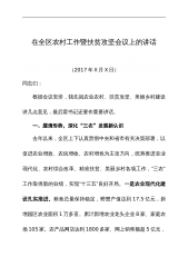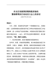 在全区迎接国家精准脱贫验收暨春耕帮扶行动动员大会上的讲话(2017年3月1日)同志们:今天,区委、区政府召开这样一个高规格的大会,主要目的是:认真贯彻落实全国扶贫开发工作和全市脱贫攻坚工作会议精神,进一步夯实产业扶贫基础,对脱贫攻坚迎“国检”进行最后冲刺总动员。一会儿,何平书记还将作重要讲话,请大家抓好落实。下面,我讲三点意见。一、充分肯定成绩,坚定打赢脱贫攻坚战的信心近年来,区委、区政府高度重视、强力推进脱贫攻坚工作见势早、力度大、措施实、要求高,精准扶贫精准脱贫工作取得显著成效。2016年,全区贫困发生率从建卡时的18.6%下降到1.7%,贫困人口人均纯收入从建卡时的2215元增加到684...