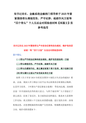 局书记局长、金融系统金融部门领导班子2025年紧紧围绕带头增强党性、严守纪律、砥砺作风方面等“四个带头”个人生活会对照检查材料【两篇文】供参考选用局书记局长2025年围绕带头严守政治纪律和政治规矩,维护党的团结统一等“四个方面”生活会对照检查材料四个带头:(一)带头严守政治纪律和政治规矩,维护党的团结统一方面(二)带头增强党性、严守纪律、砥砺作风方面(三)带头在遵规守纪、清正廉洁前提下勇于担责、敢于创新方面(四)带头履行全面从严治党政治责任方面按照《关于开好2024年度党员领导干部民主生活会的通知》要求,会前,我深入学习领会习近平总书记重要讲话重要指示精神,认真学习党章、《中国共产党纪律处分条...