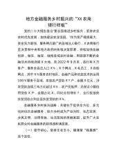地方金融服务乡村振兴的“XX农商银行样板”党的二十大报告提出“要全面推进乡村振兴,坚持农业农村优先发展,加快建设农业强国。”作为资产规模最大、资金实力最强、服务网点最广的县域法人银行,X农商银行坚决贯彻中央和地方政府的各项决策部署,持续加强金融创新,做实、做深、做精县域农村金融,用源源不断的金融活水持续浇灌X大地。至2022年9月末,该行有X万客户,服务全县总人口X%;X个网点,X名员工,X自助网点,其中X%服务农村地区。金融产品和信息技术的运用100%服务于县域。发放农户贷款X?户,余额X亿元,涉农贷款连续三年占比超过X%,农户无抵押、无保证小额信用贷款X户,金额占比X,同比分别增长?。全行...