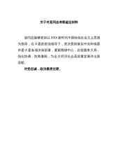 党支部考察鉴定意见(11篇)党支部考察鉴定意见篇1*同志在思想上一贯要求进步,靠近组织,认真领悟党的基本理论和基本知识按时参加政治领悟工作认真负责,领悟态度端正,善于团结同学,虚心明白批评不断克服自身缺点,思想逐步成熟,进步较快经党小组会议讨论研究,一致推荐为培养对象。党支部考察鉴定意见篇2思想上用心向党组织靠拢,自主认真领悟党的基本理论,关心时政,有较强的政治敏感度。领悟上,**同学态度认真严谨,在工作中,**同学为系宣传部部长,他工作认真,乐于助人,用心组织参加各项活动,有较强的群众荣誉感与职责心。党支部考察鉴定意见篇3经近期党组织的考察在思想认识与实践基础上进步很大,在领悟工作和生活中严...