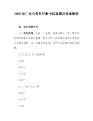 2009年广东公务员行测考试真题及答案解析第一部分数量关系一、数学推理。给你一个数列,但其中缺少一项,要求你仔细观察数列的排列规律,然后从四个供选择的选项中选择你认为最合理的一项,来填补空缺项,使之符合原数列的排列规律。1、5,12,21,34,53,80,()A.121B.115C.119D.1172、7,7,9,17,43,()A.117B.119C.121D.1233、1,9,35,91,189,()A.301B.321C.341D.3614、0,1/6,3/8,1/2,1/2,()A.5/12B.7/12C.5/13D.7/135、153,179,227,321,533,()A.789...