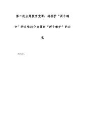第二批主题教育专题党课:将拥护“两个确立”的自觉转化为做到“两个维护”的自觉同志们:大家好!今天我要讲的主题是“将拥护‘两个确立’的自觉转化为做到‘两个维护’的自觉”。在开始今天的课程之前,我想先和大家分享一个小故事。在红军长征过程中,有一位普通的红军战士,他叫张思德。他在一次战斗中腿部中弹,但他依然坚持跟随部队前进。在长征途中,他主动承担起照顾伤员的任务,为他们抬担架、送食物。当他自己的伤口感染时,他却选择了隐瞒,继续为战友们服务。最终,他因为伤势过重而牺牲。这个故事虽然简单,但它却蕴含着一个深刻的道理:一个真正的共产党员,应该始终把党和人民的利益放在第一位,无论在什么情况下,都要坚定地拥护...