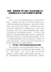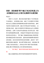 宣讲提纲:深刻领悟“两个确立”的决定性意义推动党的大会精神学习宣传贯彻走深走实同志们:根据市委统一安排,由我来到XX区宣讲党的二十大精神,下面,结合我对党的二十大精神的学习领悟,以《深刻领悟“两个确立”的决定性意义推动党的大会精神学习宣传贯彻走深走实》为题,与大家进行交流,不到之处请大家批评。“两个确立”是推动党和国家事业取得历史性成就、发生历史性变革的决定性因素,是党在新时代取得的重大政治成果,是我们应对一切不确定性的最大确定性、最大底气、最大保证,是学深悟透党的二十大精神的“政治灵魂”。学习贯彻党的二十大精神,最重要、最根本的就是深刻领悟“两个确立”的决定性意义,坚决做到“两个维护”,以高...