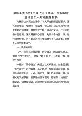 局党组书记专题民主生活会“六个带头”个人对照检查材料按照《关于开好20xx年度县以上党和国家机关党员领导干部民主生活会的通知》要求,本人紧扣本次民主生活会主题,在深入学习的基础上,结合自身实际和工作情况,对照"六个方面"内容,深入查摆问题不足,深刻剖析问题根源,进一步明确整改措施和努力方向。现作对照检查如下。一、存在的主要问题(一)在带头深刻感悟"两个确立"的决定性意义,增强"四个意识"、坚定"四个自信"、做到"两个维护"方面。能够自觉增强"四个意识"、坚定"四个自信"、拥护“两个确立",做到"两个维护",在思想上政治上行动上同以习近平同志为核心的党中央保持高度一致。但对照检查还存在:一是理论...