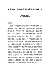 党课讲稿:坚决把“两个确立”的实践要求转化为奋进新征程、喜迎二十大的强大动力和实际行动同志们:党确立习近平同志党中央的核心、全党的核心地位,确立习近平新时代中国特色社会主义思想的指导地位,是党的十八大以来取得的最重要的政治成果,具有充分的理论依据、历史依据和现实依据。深刻领悟“两个确立”的决定性意义,坚决做到“两个维护”,关键是自觉做“两个确立”的坚定信仰者、忠诚实践者,始终在党爱党、在党言党、在党忧党、在党为党,把“两个确立”的实践要求转化为奋进新征程、建功新时代的强大动力和实际行动。一、牢记“国之大者”,提高政治判断力、政治领悟力、政治执行力“国之大者”,事关全局、事关根本、事关未来、事关...