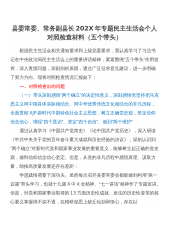 县委办副主任、党支部书记202X年年末专题民主生活会对照检查发言材料(五个带头)按照此次党史学习教育专题民主生活会的方案部署和通知要求,我聚焦会议主题,在深入学习XJP总书记在党的十九届X中X会、庆祝中国共产党成立xx周年大会、党史学习教育动员大会、中央政治局民主生活会等会议重要讲话和重要指示批示精神的基础上,严格对照“带头深刻感悟‘两个确立’的决定性意义、带头牢记我们党是什么要干什么这个根本问题、带头践行以人民为中心的发展思想、带头学习运用党在不同历史时期成功应对风险挑战的丰富经验、带头深刻汲取党史中正反两方面经验”等“五个带头”,深入开展谈心谈话,广泛征求意见建议,认真查摆问题,深刻对照剖...