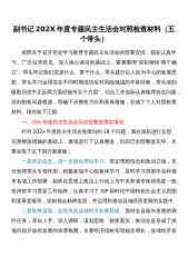 党组成员副局长纪检组长202X年专题民主生活会个人对照检查材料(五个带头)根据《关于开好党史学习教育专题民主生活会的通知》要求,下面我围绕五个带头进行对照检查,不妥之处请批评指正。一、对照查摆的突出问题(一)带头深刻感悟“两个确立”的决定性意义方面,能够忠诚拥护“两个确立”、坚决做到“两个维护”,但还存在:一是学深学全上还有差距。虽然参加了各类学习,但对党的创新理论,认识上还不深刻,领悟上还不透彻,存在片面地、表象地、局部地理解党的创新理论的现象。比如:在学习中,对自己分管的业务学的多,对其他学的少,存在重业务知识轻党建理论,重实践操作轻理论武装的问题;再比如:在学习中,没有思考理论政策背后蕴...