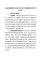 x县农业管理服务中心2023年上半年工作开展情况汇报及下半年工作计划一、上半年工作开展情况(一)农民增收。持续实施工资性收入倍增、财产性收入扩量、经营性收入壮大、转移性收入提升“四大行动”。组织参加x县2023年农村常住居民人均可支配收入记账培训,深入x镇x村、x乡x村等开展农民收入和农村固定观察点记账培训。在10个农民收入样本点村各确定1名局领导干部和1名经办业务人员联系服务10户记账户,确保收入记账数据质量。预计上半年农村常住居民人均可支配收入x元,同比增速10.9%。(二)新型农业经营主体培育。印发《关于进一步做好新型农业经营主体培育和规范提升的通知》等文件,新认定农村产业发展带头人10...