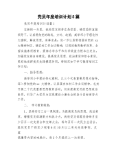 党员年度培训计划5篇党员年度培训计划篇1在新的一年里,我校党支部将在局党委、镇党委的直接领导下,认真贯彻党的路线、方针、政策;高举邓小平理论伟大旗帜,解放思想,实事求是;进一步认真贯彻落实党的xx大精神和区、镇农村工作会议精神;以促进教育教学改革、全面实施素质教育、提高办学水平和办学效益为根本出发点,加强党支部自身建设,提高党员思想、政治素质和综合素质,更好地发挥党员先锋模范作用,特制定如下学习教育培训工作计划:一、指导思想:高举邓小平理论伟大旗帜,以三个代表重要思想为指导,深入贯彻党的xx大精神,认真落实农村工作会议精神,扎实开展三个代表重要思想教育活动,切实提高党员的思想政治素质,引导广大...