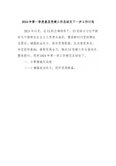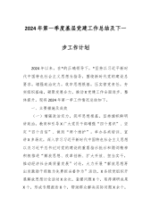 2024年第一季度基层党建工作总结及下一步工作计划2024年以来,在XX的正确领导下,XX坚持以习近平新时代中国特色社会主义思想为指导,围绕新时代党的建设总要求,增强政治定力,筑牢思想根基,压实管党责任,夯实组织基础,凝聚发展合力,推动XX党建工作全面进步、整体提升。现将2024年第一季工作情况总结如下。一、主要措施及成效(一)增强政治定力,筑牢思想根基。坚持旗帜鲜明讲政治,教育和引导XX广大党员干部增强“四个意识”、坚定“四个自信”、做到“两个维护”。举办各类培训、宣讲XX多场次,深入学习习近平新时代中国特色社会主义思想以及习近平总书记对XX工作的重要指示批示和题词精神。积极推进“解放思想、...