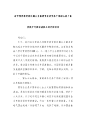 在市国资委党委所属企业基层党组织党务干部综合能力素质提升专题培训班上的开班讲话同志们:今天,我们在这里举办市国资委党委所属企业基层党组织党务干部综合能力素质提升专题培训班,主要任务是深入学习贯彻党的XX大、二十届三中全会精神和习近平总书记关于国有企业改革发展和党的建设的重要论述,全面落实中央八项规定精神,聚焦提升基层党务干部综合能力素质,推动国企党建与业务深度融合,为国资国企高质量发展提供坚强组织保证。下面,我结合国资国企实际,讲四个方面的意见。一、紧扣中央精神,深刻领会党务干部能力培训对国企发展的关键意义国有企业是中国特色社会主义的重要物质基础和政治基础,是我们党执政兴国的重要支柱和依靠力量...