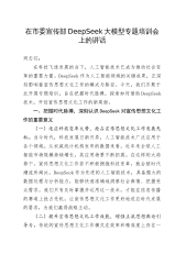 在2025年某某市直机关DeepSeek应用专题辅导培训班开班仪式上的讲话大家好!非常高兴能够参加今天的开班仪式。在数字化变革的浪潮中,人工智能已成为推动各领域创新发展的关键力量。DeepSeek作为人工智能领域的前沿成果,正以其强大的功能和广泛的适用性,为诸多行业带来全新的发展机遇。对于我们某某市直机关工委而言,积极引入和应用DeepSeek技术,是顺应时代发展潮流、提升机关工作效能、更好服务群众的必然选择。今天,我们齐聚于此,举办此次DeepSeek应用专题辅导培训班,旨在让大家深入了解这一技术,掌握其在政务工作中的应用技巧,为我们的工作注入新的活力。下面,我结合开展DeepSeek培训的...