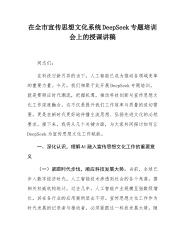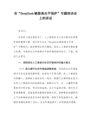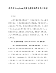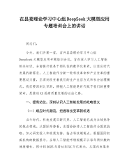 县委书记在县委理论学习中心组DeepSeek大模型应用专题培训会议上的讲话同志们:在数字化浪潮奔涌的当下,人工智能正以雷霆万钧之势重塑我们的生产生活、工作与思维模式。今天,我们齐聚于此,开展县委理论学习中心组DeepSeek专题培训,就是要紧跟时代脉搏,把握科技发展大势,以人工智能赋能XX县各项事业,开创高质量发展新局面。下面,我谈几点意见。一、强化思想认知,树立拥抱AI的积极态度(一)洞悉科技变革大势,敏锐捕捉发展先机。当前,以人工智能为代表的新一轮科技革命和产业变革风起云涌,正成为重塑全球经济结构、改变人类生活方式的关键力量。从国家层面来看,《新一代人工智能发展规划》明确提出要抢抓人工智能...