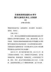 在湖南高铁院建校60周年暨乔迁新校区典礼上的致辞XXX(X年X月X日)尊敬的清泉老书记、远清老部长,各位领导,各位嘉宾,老师们、同学们:大家上午好!今天,我们在这里隆重庆祝湖南高速铁路职业技术学院建校60周年暨乔迁新校区。首先,我代表市委、市人大市政府、市政协向湖南高速铁路职业技术学院建校60周年暨乔迁新校区表示热烈的祝贺!向出席庆典的各位领导、历届校友表示诚挚的欢迎!向长期以来关心支持XX职业教育发展的社会各界表示衷心的感谢!2005年3月,铁工校升格为铁工院;2011年4月,铁工院更名为高铁院;今天,高铁院又乔迁新校区。这不是简单的升格、简单的更名、简单的乔迁,6年时间实现了升格、更名、乔...