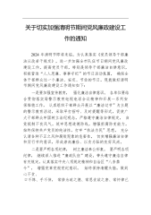 关于切实加强清明节期间党风廉政建设工作的通知2024年清明节即将来临,为认真落实《党员领导干部廉洁从政若干规定》,进一步加强全市队伍节日期间党风廉政建设工作,提高党员干部,特别是领导干部廉洁自律意识,积极营造“人人思廉、事事守纪”的节日活动氛围,确保全体干部群众过一个廉洁、安定、节俭的节日。现就做好清明节期间党风廉政建设工作通知如下:一是要加强宣传教育,强化廉洁自律意识。各单位要结合贯彻落实局警示教育电视电话会议精神和开展一系列安保维稳工作,认真组织干部群众开展以“廉洁过节”为主题的警示教育活动,采取早打招呼、及时提醒等形式,促使广大干部群众牢固树立法纪观念,严格遵守廉洁自律规定,自觉抵制不良...