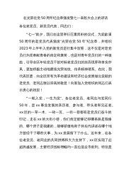 在光荣在党50周年纪念章颁发暨七一表彰大会上的讲话各位老党员、新党员代表,同志们:“七一”前夕,我们在这里举行庄重简朴的仪式,为党龄满50周年的老党员代表颁发“光荣在党50年”纪念章,并组织2023年上半年入党的新党员进行集中宣誓,这不仅是对老党员们为党奉献青春的肯定和褒奖,也是对青年党员们的一种激励,引导全区年轻党员干部对标老党员们的崇高境界和务实作风,更加积极主动地赓续光荣传统、传承精神谱系。在此,我代表区委,向全区所有为革命建设和经济社会发展做出贡献的老党员、老同志致以崇高的敬意!向新加入党组织的同志们表示衷心的祝贺!“一朝入党,一生为党”。各位老党员、老同志与党同行50年,是xx事业发...