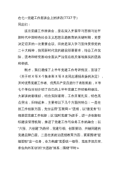 在全市机关庆七一表彰大会暨党的工作推进会上的讲话烈日炎炎,骄阳似火,我们大家冒着酷暑来参会,相信大家的心情也是一样的。每一个党员都是一面旗帜,每一个支部都是一个堡垒,散是漫天星,聚是一团火。我们怀着对党、对人民、对事业火热的激情,隆重庆祝中国共产党成立102周年并进行“七一”表彰。市委书记xxx同志对这次会议非常重视,对机关党务工作者非常关心,会前再三强调,要认真开好这次会议,要通过这次会议,动员全市机关各级党组织和广大党员,以党建“第一责任”引领和保障发展“第一要务”,以党的建设高质量推动全市经济社会发展高质量、推动全市各项事业高质量。刚才,xx同志宣读了表彰决定,会议表彰了优秀党员、优秀党...