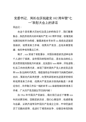 党委书记、局长在庆祝建党102周年暨“七一”表彰大会上的讲话同志们:在这个具有重大历史纪念意义的特殊日子,我们隆重集会,热烈庆祝伟大的中国共产党102周年华诞,歌颂党的光辉历程和丰功伟绩,隆重表彰全市全市xx系统先进基层党组织、优秀党务工作者、优秀共产党员,总结并展望党建、创先争优等重点工作。刚才,xxx宣读了表彰通令,对受到表彰的先进单位和个人进行了颁奖。这些受到表彰的同志,是在各自岗位上坚决贯彻党的路线方针政策,忠实践行xxx精神,开拓进取,扎实工作的优秀代表,体现了新时期共产党人的优良品质和xxx队伍的时代风范,都是值得全市各级学习的典范标杆。在此,我首先代表局党委,向受到表彰的先进基层...