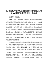 在“喜迎七一传承红色基因血脉文化引领助力青年xx建设”主题党日活动上的讲话各位领导、同志们:大家好!后天,就是建党101周年,全党全国通过各种方式举行热烈的庆祝纪念活动,讴歌我们党建党一百多年来走过的不平凡历程和取得的非凡业绩。此时,我们三家单位齐聚读者出版集团,以吸吮文化乳汁、感悟文化力量、坚定文化自信的方式,共庆党生共话发展,为助力xx经济社会高质量发展贡献力量。在此,我代表市xx党支部向曾为国防事业做出突出贡献和奋战在各条战线上的老党员、年轻党员表示诚挚的慰问和节日的祝福,对读者出版集团和xx交通银行xx分行提供的大力支持表示衷心的感谢。今天的活动,既是贯彻落实XJP总书记关于文化自信重...