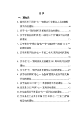 目录一、通知类1.端州区关于开展“七一”前重点行业重点人员核酸检测工作的通知................................................................62.关于“七一”期间组织开展有关活动的通知.................83.关于甘德县开展“庆七一•喜迎二十大”藏汉书法比赛的通知..........................................................................134.关于举办“学理论·迎七一”学习强国学习积分10日冲刺赛的通知........................