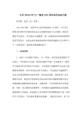 X区2022年”七一“建党101周年系列活动方案各党委、各党(总)支部:今年101周年,也是中华人民共和国成立72周年。为了深入贯彻XJP新时代中国特色社会主义思想和党的十九大精神,组织开展好“不忘初心、牢记使命”主题教育,进一步激发全区基层党组织和党员干部活力,决定在全区各级党组织中开展庆祝建党101周年“十个一”系列活动,现就有关事项通知如下:一、活动内容1、组织一次专题学习研讨。“七一”前后,全区各党支部要以“不忘初心、牢记使命”为主题,组织党员集中开展一次专题学习,要把学习重温XJP总书记在“不忘初心、牢记使命”主题教育工作会议上的重要讲话精神、XXX书记在全省“不忘初心、牢记使命”主...
