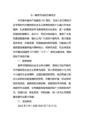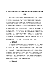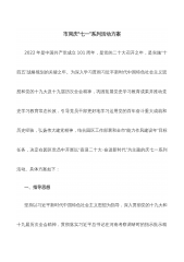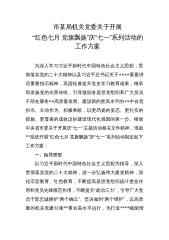 市某局机关党委关于开展“红色七月党旗飘扬”庆“七一”系列活动的工作方案为深入学习习近平新时代中国特色社会主义思想,贯彻落实党的二十大精神以及习近平总书记关于××××重要讲话重要指示精神,巩固拓展提升党史学习教育成果,继承和发扬党的光荣传统,引导激励各基层党组织和广大党员干部在服务××高质量发展、建设新的更高水平的××中自觉担当、主动作为、积极奉献,以更昂扬的姿态、更扎实的措施、更显著的成效迈好建设现代化强国的第一步。根据中央省市委关于开展庆“七一”主题活动相关文件精神,现就**系统开展“红色七月党旗飘扬”庆“七一”系列活动制定如下工作方案:一、指导思想以习近平新时代中国特色社会主义思想为指导,...