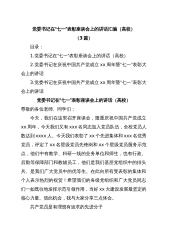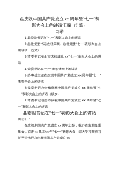 在庆祝中国共产党成立xx周年暨“七一”表彰大会上的讲话汇编(7篇)目录1.县委副书记在“七一”表彰大会上的讲话2.总社党委书记在轻工联、总社党委“七一”表彰大会上的讲话(范文)3.市委书记在全市庆祝建党xx“七一”表彰大会上的讲话4.党委书记在“七一”表彰大会上的讲话5.办事处主任在庆祝中国共产党成立xx周年暨“七一”表彰大会上的讲话6.党委书记在全镇庆祝中国共产党成立xx周年暨“七一”表彰大会上的讲话(镇乡)7.市委书记在全市庆祝中国共产党成立xx周年暨“七一”表彰大会上的讲话县委副书记在“七一”表彰大会上的讲话同志们:在庆祝中国共产党成立xx周年之际,我们在这里隆重集会,召开xx县20xx...