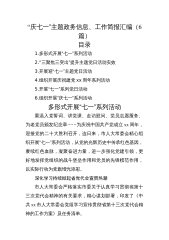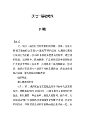 2022年七一汇编大合集(59篇)目录一、通知类1.端州区关于开展“七一”前重点行业重点人员核酸检测工作的通知52.关于“七一”期间组织开展有关活动的通知73.关于甘德县开展“庆七一喜迎二十大”藏汉书法比赛的通知•124.关于举办“学理论·迎七一”学习强国学习积分10日冲刺赛的通知155.关于开展“同心庆七一喜迎二十大”系列活动的通知176.关于在“七一”期间开展庆祝建党101周年系列活动的通知227.关于在“七一”前夕开展主题党日活动的通知288.关于组织开展“迎七一·助创城”星期六机关干部义务劳动的通知339.关于做好2022年“七一”表彰推荐工作的通知3510.克东县2022年庆“七一”...
