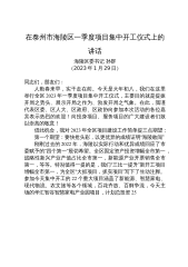在泰州市海陵区一季度项目集中开工仪式上的讲话海陵区委书记孙群(2023年1月29日)同志们,朋友们:人勤春来早,实干走在前。今天是大年初八,我们在这里举行全区2023年一季度项目集中开工仪式,主要目的就是提振开局之势头、展示开局之作为、勃发开局之气象。在此,我谨代表区委、区人大、区政府、区政协向参加本次活动的各位嘉宾表示热烈的欢迎!向投身项目、服务项目的广大建设者们致以崇高的敬意!借此机会,我对2023年全区项目建设工作简单提三点期望:第一个期望:要快抢头彩,以更优异的成绩证明“海陵敢闯”刚刚过去的2022年,海陵以实际行动和优异成绩回应了市委赋予的“四个第一”殷切希望。全区固定资产投资增幅全...
