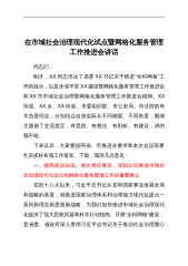 在市域社会治理现代化试点暨网格化服务管理工作推进会讲话同志们:刚才,XX同志传达了省委XX书记关于推进“全科网格”工作的批示,以及全省平安XX建设暨网格化服务管理工作推进会和XX市市域社会治理暨网格化服务管理工作推进会精神。XX街道、XX乡、XX街道、市委组织部、市公安局、市法院的有关负责同志,分别结合自身实际从不同侧面、不同角度,围绕主题做了交流发言,有思路、有想法、有剖析、有建议,讲的都不错。下来以后,大家要按照省、市推进会要求和本次会议部署扎实抓好各项工作落实。下面,我讲几点意见:一、提高政治站位,强化责任意识,深刻认识推进市域社会治理现代化试点和网格化服务管理工作的重要意义党的十八大以...