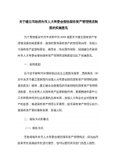 关于建立市政府向市人大常委会报告国有资产管理情况制度的实施意见为了贯彻落实中共中央和中共XXX省委关于建立国有资产管理情况报告制度要求,加强对我市国有资产的管理和治理,实现人大国有资产监督制度化、规范化,结合我市实际,现就建立市政府向市人大常委会报告国有资产管理情况制度提出以下实施意见。一、指导思想以习近平新时代中国特色社会主义思想为指导,贯彻落实《中共中央关于建立国务院向全国人大常委会报告国有资产管理情况制度的意见》精神,建立健全全面规范的市政府报告国有资产管理情况制度,充分发挥人大国有资产监督职能作用,紧紧围绕市委中心工作和我市经济社会发展的总体布局,加强人大和全社会对国有资产的监督,推进...