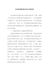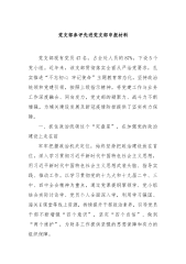 先进党支部事迹申报材料中国共产党**市委政策研究室机关一支部现有党员33名(占机关在职在编干部职工34人的97.1%)。近年来,我们按照“一个支部就是一个堡垒,一名党员就是一面旗帜”的要求,围绕党建工作目标,结合政研工作实际,不断强化领导、创新思路、规范机制,切实增强了党组织的凝聚力和战斗力,成功锻造了一支特别能吃苦耐劳,敢打硬仗的党员队伍,高质高效完成了各项工作任务,得到上级组织的认可和社会的好评。一、加强思想建设,树牢党员干部政治意识。始终坚持把学习教育放在首位,全面加强党员思想政治建设,全力推动机关党建工作向先进党组织标准挺进。一是狠抓思想建设。始终把思想建设作为抓好党建工作的“根”和“...