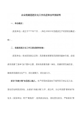 企业党建思想文化工作先进单位申报材料一、单位概况:(某某单位)成立于****年**月,(单位2022年党建及生产经营情况概述:略)。二、党建思想文化工作主要成绩和经验:(某某单位)党支部深刻认识到:高质量发展要靠高质量党建来引领。必须抓实党建“三基本”这个重中之重,坚持高质量党建一体化,党建经营互融互促,确保抓党建抓出生产力、抓出凝聚力、抓出战斗力。抓住“关键少数”在思想上融入。生产经营的基础在于领导班子的认识入位、责任归位和意识到位,从抓好“关键少数”入手,把公司、分公司党委“要求的”转化为(某某单位)班子“聚焦的”,提高政治站位、强化责任担当。严格落实“第一议题”制度,开展党史学习教育集中...