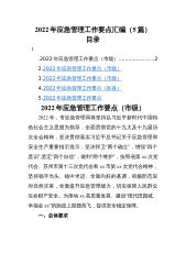 2022年应急管理工作要点汇编(5篇)目录1.2022年应急管理工作要点(市级)......................22.2022年应急管理工作要点(市级)3.2022年应急管理工作要点(市级)4.2022年应急管理工作要点(区县)5.2022年应急管理工作要点2022年应急管理工作要点(市级)2022年,市应急管理局将坚持以习近平新时代中国特色社会主义思想为指导,全面贯彻党的十九大及十九届历次全会精神,坚决贯彻落实习近平总书记关于应急管理和安全生产重要指示批示,坚决捍卫“两个确立”,增强“四个意识”,坚定“四个自信”,做到“两个维护”,按照省第xx次党代会、苏州市第十三次党代会和xx...