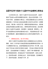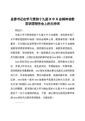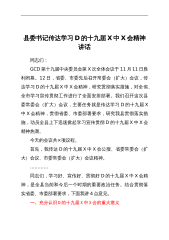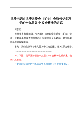县委书记在县委常委会(扩大)会议传达学习党的十九届X中X会精神的讲话同志们:按照省市安排部署,今天我们召开县委常委会(扩大)会议,主要任务是认真学习党的十九届X中X会精神,研究部署我县贯彻落实措施。首先,我们集体学习十九届X中X会公报,请XX同志领学。......................................................一、下面,关于深刻领会十九届X中X会精神实质内涵,我讲几点意见。一要深刻认识党的十九届X中X会胜利召开的重要意义。党的十九届X中X会,是在我们党成立xx周年的重要历史时刻,在党和人民胜利实现第一个百年奋斗目标、全面建成小康社会、正在向全面建...