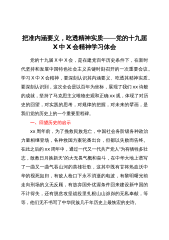 把准内涵要义,吃透精神实质——党的十九届X中X会精神学习体会党的十九届X中X会,是在建党百年历史条件下,在新时代坚持和发展中国特色社会主义关键时刻召开的一次重要会议。学习X中X会精神,要深刻认识其内涵要义、吃透其精神实质。要深刻认识到,这次全会是以百年为坐标,展现了我们xx诗般的成就,坚持了马克思主义唯物史观和正确xx观,体现了对历史的回望,对实践的思考,对规律的把握,对未来的擘画,是我们党的历史上的一个重要里程碑。一、回望历史的启示xx周年前,为了挽救民族危亡,中国社会各阶级各种政治力量相继登场,各种救国方案轮番出台,但都以失败而告终。在此之后的xx周年中,通过一代又一代共产党人“为有牺牲多...