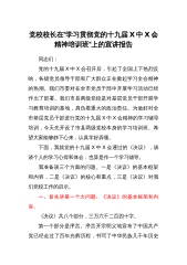 党校校长在“学习贯彻党的十九届X中X会精神培训班“上的宣讲报告同志们:党的十九届X中X会召开后,引起了全国上下热烈反响,各级党员领导干部和广大群众正在掀起学习全会精神的热潮。我们市委对在全市党员干部中开展学习活动已经作出了部署。我们市县两级党校是对基层党员干部开展学习教育培训的基地,肩负着重大的政治责任。为做好对全市基层党员干部进行党的十九届X中X会精神的学习辅导培训,今天先开设了市县两级党校本身的学习培训班。希望大家能够静下心来,认真学好弄懂。下面,我就党的十九届X中X会通过的《决议》,谈谈个人的学习心得和体会,也算是作一个学习辅导。我准备谈三个方面的问题。一是《决议》的基本框架和内容,二是...
