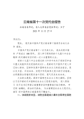 云南省第十一次党代会报告云南省委书记,省人大常委会党组书记:王宁2021年11月27日同志们:现在,我代表中国共产党云南省第十届委员会向大会作报告。中国共产党云南省第十一次代表大会,是在庆祝中国共产党成立100周年,深入学习贯彻党的十九届六中全会精神的关键时刻召开的一次十分重要的大会。党的十九届六中全会通过的《中共中央关于党的百年奋斗重大成就和历史经验的决议》,是新时代中国共产党人牢记初心使命、坚持和发展中国特色社会主义的政治宣言,是以史为鉴、开创未来、实现中华民族伟大复兴的行动指南,必将激励全党锚定既定奋斗目标、意气风发走向未来。大会的主题是:高举中国特色社会主义伟大旗帜,坚持以习近平新时代...