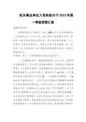 机关事业单位入党积极分子2023年第一季度思想汇报尊敬的党支部:在党组织的关心培养下,我于202x年x月份被确定为入党积极分子。今年以来,我认真学习党的理论知识,积极参加党支部开展的各项活动,努力向党组织靠拢。个人对党认识更加全面深入,思想认识有了很大提高,进一步坚定了自己的选择,加入党组织的愿望更加迫切。现将近段时间自己的思想、学习、工作等情况向党组织汇报如下:一、加强理论学习,提高思想觉悟。今年以来,我积极参加集体学习,努力学习党的基本理论,牢固树立正确的世界观、人生观和价值观,不断增强政治上的坚定性和对客观事物的洞察力。在学习内容上,重点学习了xx报告、《中国共产党xx全国代表大会文件汇...