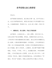 在市城市管理和综合执法局2025年春节节后收心会上的讲话同志们:大家新年好!春节假期已经结束,我们齐聚在此召开节后收心会。过去的春节期间,全市城管部门坚守岗位,严格落实市委市政府部署,对重点行业领域开展督查检查,确保了城市管理领域工作的平稳有序,展现出了高度的责任感和敬业精神。在此,我代表局党组,向节日期间坚守岗位的同志们表示衷心的感谢和崇高的敬意!2025年是“十四五”规划实施的收官之年,也是“十五五”规划编制之年,做好城市管理工作意义重大。新的一年,我们要以习近平新时代中国特色社会主义思想为指导,全面贯彻党的二十大和二十届二中、三中全会精神,深入落实习近平总书记对城市管理工作的系列重要论述...