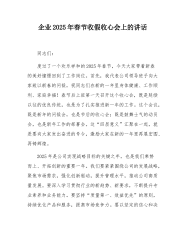 主要负责人在全体干部大会暨2025春节节后收心会上的讲话(审计)同志们:新春伊始,万象更新!今天,我们召开全体干部大会暨2025春节节后收心会,既是对假期状态的总结,更是吹响新一年审计工作的冲锋号。在此,我谨代表局领导班子,向全体干部职工致以诚挚的新春祝福,祝愿大家在新的一年里,身体健康、工作顺利、阖家幸福!刚刚过去的春节假期,大家暂时放下了繁重的工作,享受了难得的团圆时光。但“关山初度尘未洗,策马扬鞭再奋蹄”,作为审计人,我们必须清醒认识到,2025年是“十四五”规划的收官之年,也是我市推进高质量发展的攻坚之年,审计工作责任重大、使命光荣。我们要以更加坚定的信心、更加昂扬的斗志,在新的一年里...