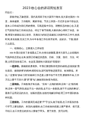 2023收心会的讲话简短发言同志们:新春伊始,万象更新。我代表局班子给大家拜个晚年,祝大家在新的一年里,身体健康、工作顺利、阖家幸福。节后上班第一天召开全体干部会议,基本上已经成为咱们局的惯例。它既是集中归位、调整状态的收心会,又是打气鼓劲开始工作的动员会。经过了春节假期,大家的身心得到了休息、休整,希望大家能以信心百倍、充满活力的状态迅速投入到新年的工作中,抢抓时间,务实创新,扎实工作,为今年各项工作任务开好局、起好步。下面,我讲三点意见。一、收假收心,立即进入工作状态XXX年我们安排了多项重点工作,任务比较繁重,要求大家马上从假期的气氛和状态里走出来,按照已经确定的思路、目标、方案、路径、...