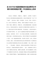 在2025年乡巩固拓展脱贫攻坚成果同乡村振兴有效衔接驻村第一书记座谈会上的讲话同志们:乡村振兴,关键在人,关键在干。驻村第一书记和工作队“”“是上级党委派来加强基层组织、推动乡村振兴的尖兵和先”锋。这次会议,既是一次见面会、交心会,更是一次责任上肩、任务上手的动员会、誓师会。希望大家通过今天的会议,进一步统一思想、凝聚共识、明确方向,以更加饱满的热情、更加昂扬的斗志、更加务实的作风,投身到*乡乡村振兴的伟大实践中来。今天,我们在这里召开第六轮驻村第一书记座谈会,主要任务是深入学习贯彻中央和省、市、县关于全面推进乡村振兴的决策部署,总结经验、分析形势,并对下一步工作进行安排部署。在座的有乡领导班...