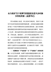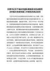区委书记关于做好巩固拓展脱贫攻坚成果同乡村振兴有效衔接工作报告的表态发言习近平总书记在全国脱贫攻坚总结表彰大会上强调,切实做好巩固拓展脱贫攻坚成果同乡村振兴有效衔接各项工作,让脱贫基础更加稳固、成效更可持续。2021年中央一号文件提出,实现巩固拓展脱贫攻坚成果同乡村振兴有效衔接。做好巩固拓展脱贫攻坚成果同乡村振兴有效衔接,关系到构建以国内大循环为主体、国内国际双循环相互促进的新发展格局,关系到全面建设社会主义现代化国家全局和实现第二个百年奋斗目标。xx市xx区素有“天府膏腴之地、川东鱼米之乡”之称,历来是xx农业大区及产粮产油大区,是xx唯一集国家农业产业化示范基地、国家农业科技创新与集成示范...