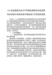 XX县监察委员会关于巩固拓展脱贫攻坚成果同乡村振兴有效衔接专项监督工作情况的报告近年来,XX县监察委员会认真贯彻落实党中央及省市县委关于巩固拓展脱贫攻坚成果同乡村振兴有效衔接的决策部署,充分发挥监督保障执行、促进完善发展作用,紧扣全县过渡期目标任务、工作重点和措施落实,为全县巩固拓展脱贫攻坚成果同乡村振兴有效衔接提供坚强保障。下面,我代表县监委报告全县巩固拓展脱贫攻坚成果同乡村振兴有效衔接专项监督工作情况,请予审议:一、工作开展情况(一)加强监察监督,推动巩固拓展脱贫攻坚成果同乡村振兴有效衔接建立健全工作衔接机制。以省监委《巩固拓展脱贫攻坚成果同乡村振兴有效衔接监督工作清单》为遵循,结合县情实...