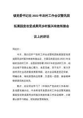 镇党委书记在2022年农村工作会议暨巩固拓展脱贫攻坚成果同乡村振兴有效衔接会议上的讲话同志们:今天,我们召开**农村工作会议暨巩固拓展脱贫攻坚成果同乡村振兴有效衔接会议,主要目的是总结2021年全镇农业农村工作,全面安排部署2022年农业农村工作,动员全镇干部群众凝心聚力、攻坚克难、苦干实干,努力开创经济社会高质量发展新局面。这次会议既是坚定目标、明确任务、细化职责的总部署,又是统一思想、振奋精神狠抓落实的总动员。刚才,会议传达学习了《中国共产党农村工作条例》及省委实施办法,中央和省市县委农村工作会议暨巩固拓展脱贫攻坚成果同乡村振兴有效衔接工作会议精神,大家要认真学习领会,切实抓好贯彻落实。下...