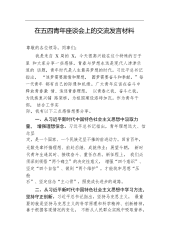 在五四青年座谈会上的发言:弘扬五四精神争做有为青年 尊敬的各位领导,同事们: 我是*,很高兴今天还能代表“五四”青年干部参加这个座谈会,很振奋、也很受鼓。人生的路很长,我想,在座的很多青年人将和我一样,把人生最美丽的青春留给工作,若干年后,能一起回忆这段难忘的时光。当我们还是青年时,就应该有青年的特点,积极思考、富有朝气、充满活力;过了青年的年龄,也要努力保持年轻的心态,做事积极一点、做人阳光一些,少一些暮气和惰性。我围绕今天座谈会的主题谈一谈体会: 一是认清理想之重,珍惜青春年华。理想信念是管总的,包括人生观、价值观、事业观、成就观都需要正确的理想信念来做保障。所以青年干部对未来的向往...